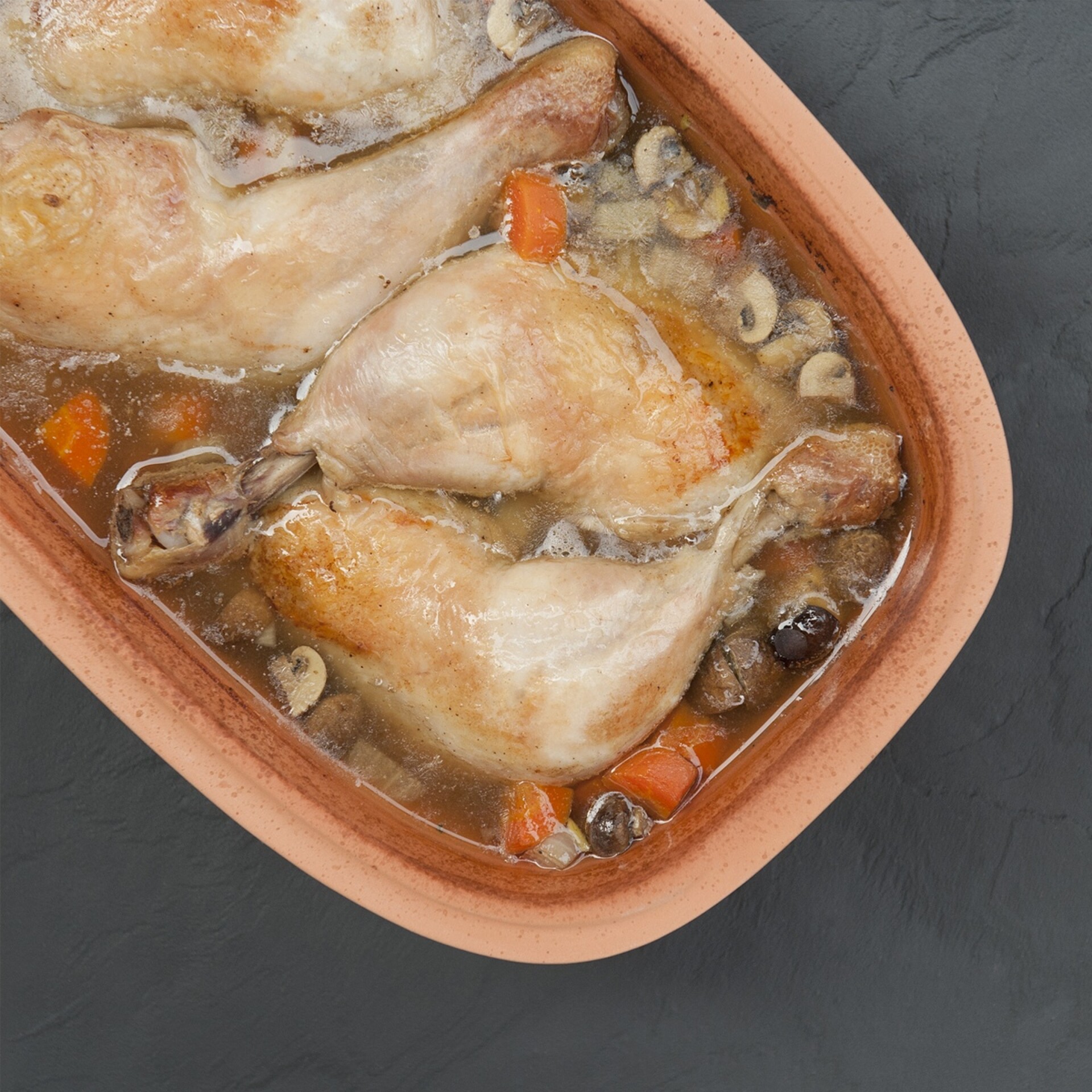 Probieren Sie auch einmal Coq au Vin aus dem Römertopf: Hähnchenkeulen salzen, pfeffern und mit Öl bestreichen. Die restlichen Zutaten wie Zwiebeln, Karotten, Sellerie, Champignons und Knoblauch mit je 1/8 Liter Weißwein und Brühe in den gewässerten Römertopf geben, die Keulen darauf legen. Deckel drauf, in den kalten Backofen stellen und bei 175° Umluft (200° Ober-/Unterhitze) rund 1,5 Stunden garen.