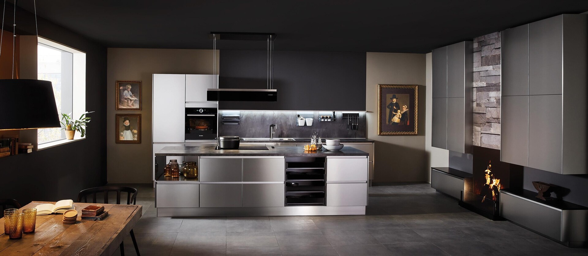 Es liegt im Trend, abseits der bekannten Pfade zu wandeln. Wir interpretieren dies mit einer Küche der Glamour-Klasse. Schnörkellos und dennoch raffiniert. Die Metallic-Front und die klaren Linien sind die Grundlage für eine stilvolle Atmosphäre. Das Gegengewicht: Warme Farben, wohnliche Elemente wie ein Kaminfeuer und „weiche“ Materialien wie Holz. Das Ergebnis? Eine Küche der Zukunft, die Lebensfreude, Individualität und Innovation verbindet.