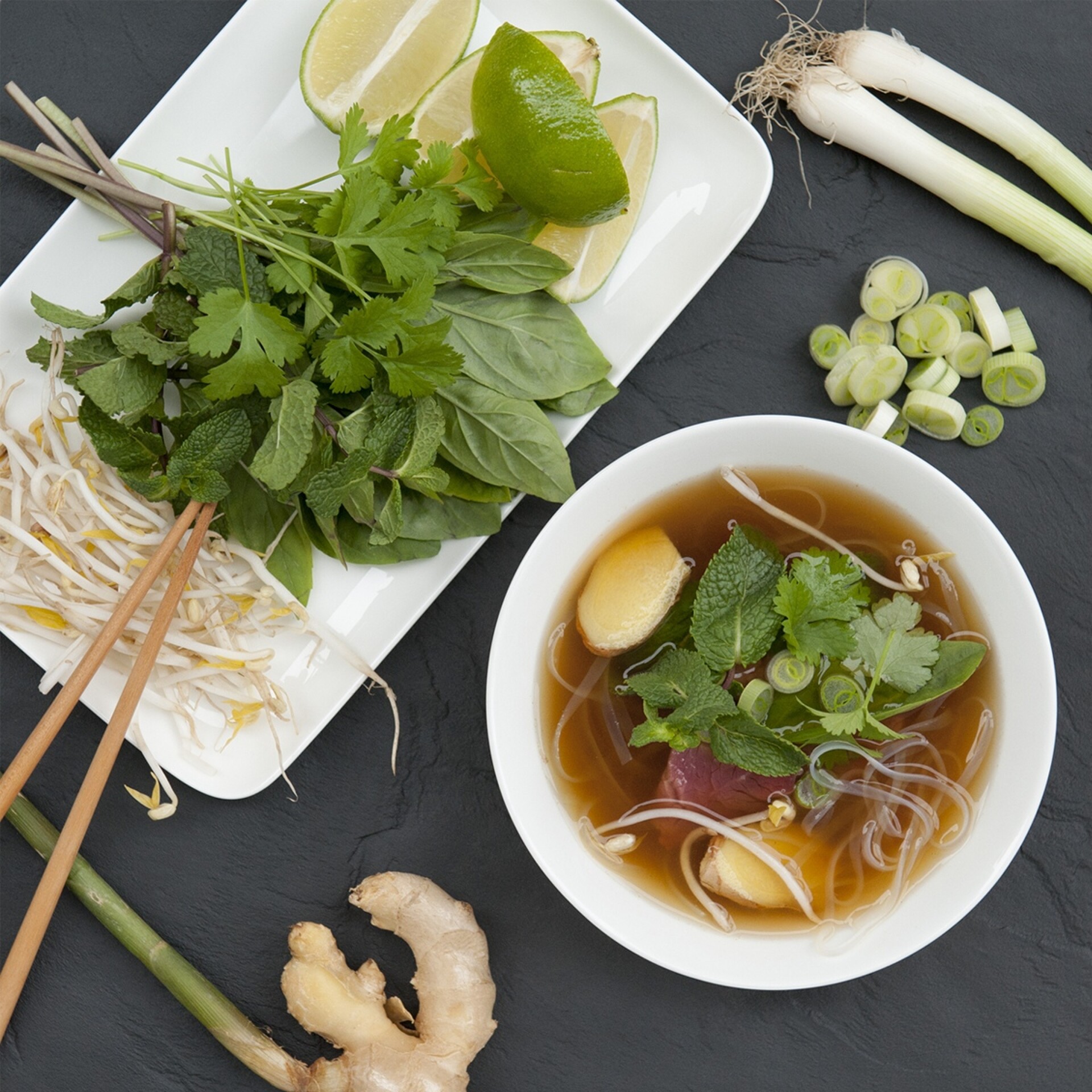 Pho wird im Land der Drachen sogar zum Frühstück gegessen. Die  vietnamesische Nudelsuppe besteht aus einer kräftigen Rinderbrühe mit Rinder- (Pho Bo) oder Hühnerfleischstückchen (Pho Ga). Auch ein paar Spritzer Fischsauce sind enthalten, Reisnudeln, Frühlingszwiebeln, Koriandergrün, Minze und frische Sprossen.