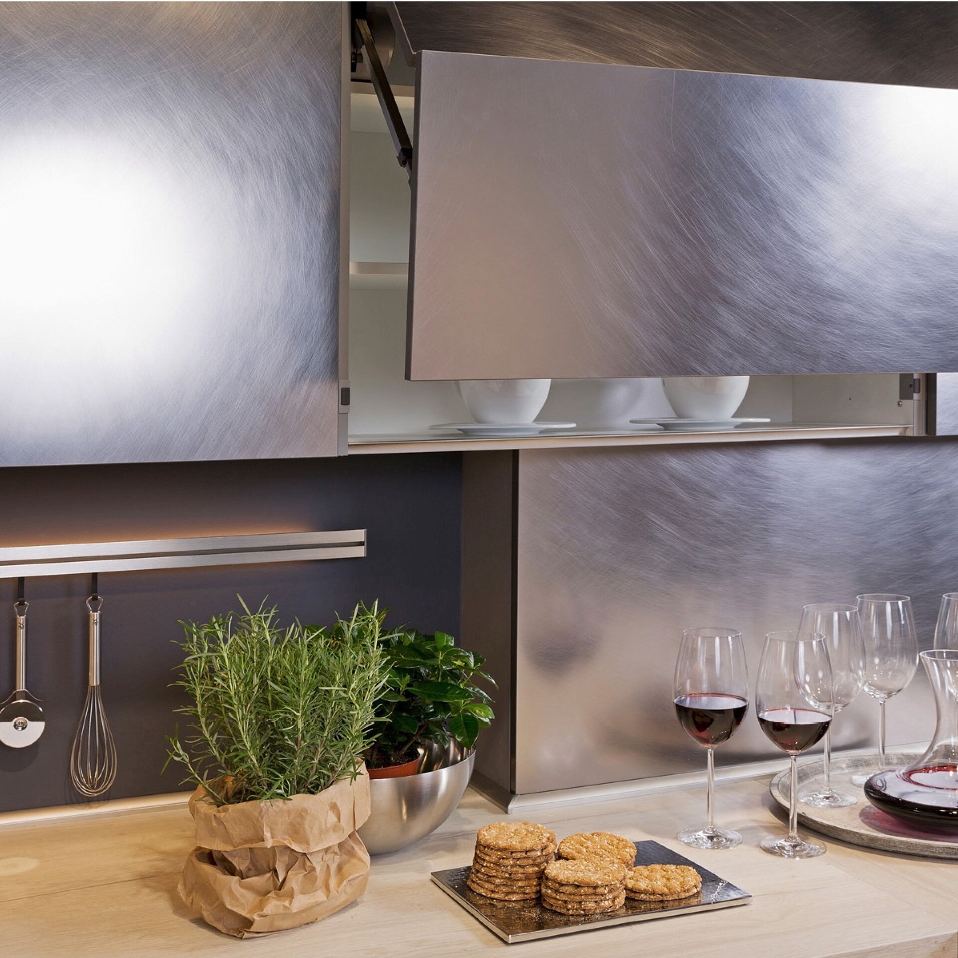 Das ist zum Beispiel unserer Küchenlinie Albarino gelungen. Ihre Fronten in Metall-Optik setzen nun wirklich ausgefallene Akzente. Albarino bietet noch zahlreiche andere raffinierte Oberflächen – von den klassischen Fronten über Schiefer- und Betonoptik bis hin zu edlem Mattschwarz.