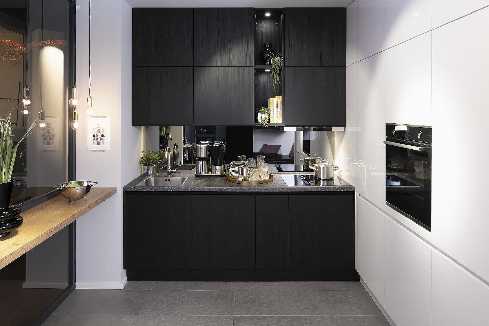 Tiny Kitchen kann auch elegant sein – das beweist dieses Küchenbeispiel. Wenn Sie also nur wenig Platz zur Verfügung haben oder die kleine Küche in Ihrer Ferienwohnung modernisieren möchten, fragen Sie uns nach stilvollen Lösungen, bei denen ganz nebenbei auch noch jede Menge Stauraum geschaffen wird. Für die Frontenwahl empfehlen wir auch starke matt- und hochglänzende Kontraste, denn so können gerade Mini-Küchen richtig groß rauskommen.